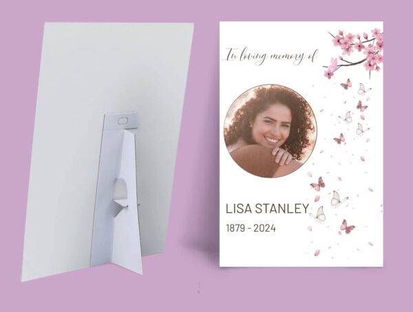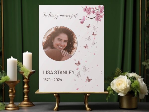 Honour your loved one’s life with “Blossom and butterflies theme funeral memory board” a beautifully designed tribute perfect for any funeral or celebration of life. This personalised memorial board features beautiful blossom with butterflies symbolizing warmth, beauty, and the enduring spirit of life.