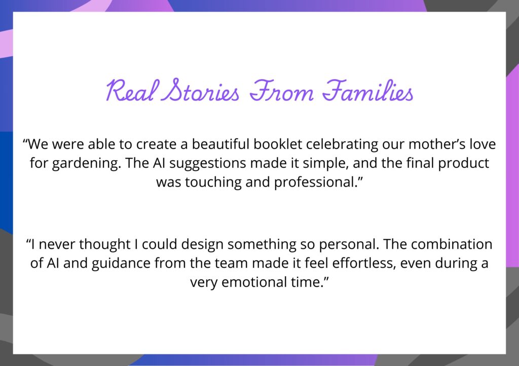 Creating an order of service is more than just listing readings and hymns; it is about honouring a life in a way that is personal, professional, and lasting. Families can use AI and compassionate design support provided by us to craft a keepsake that honours the life of your loved one.