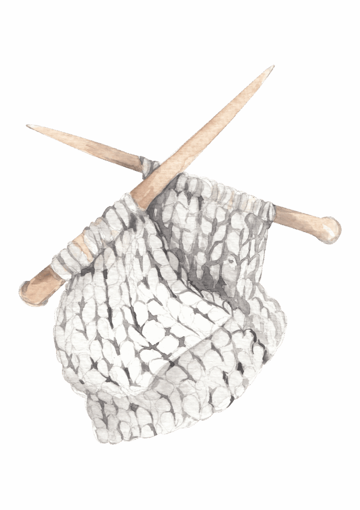 - A sewing kit with colourful threads and fabric pieces, sketched in a soft, cosy illustration style.