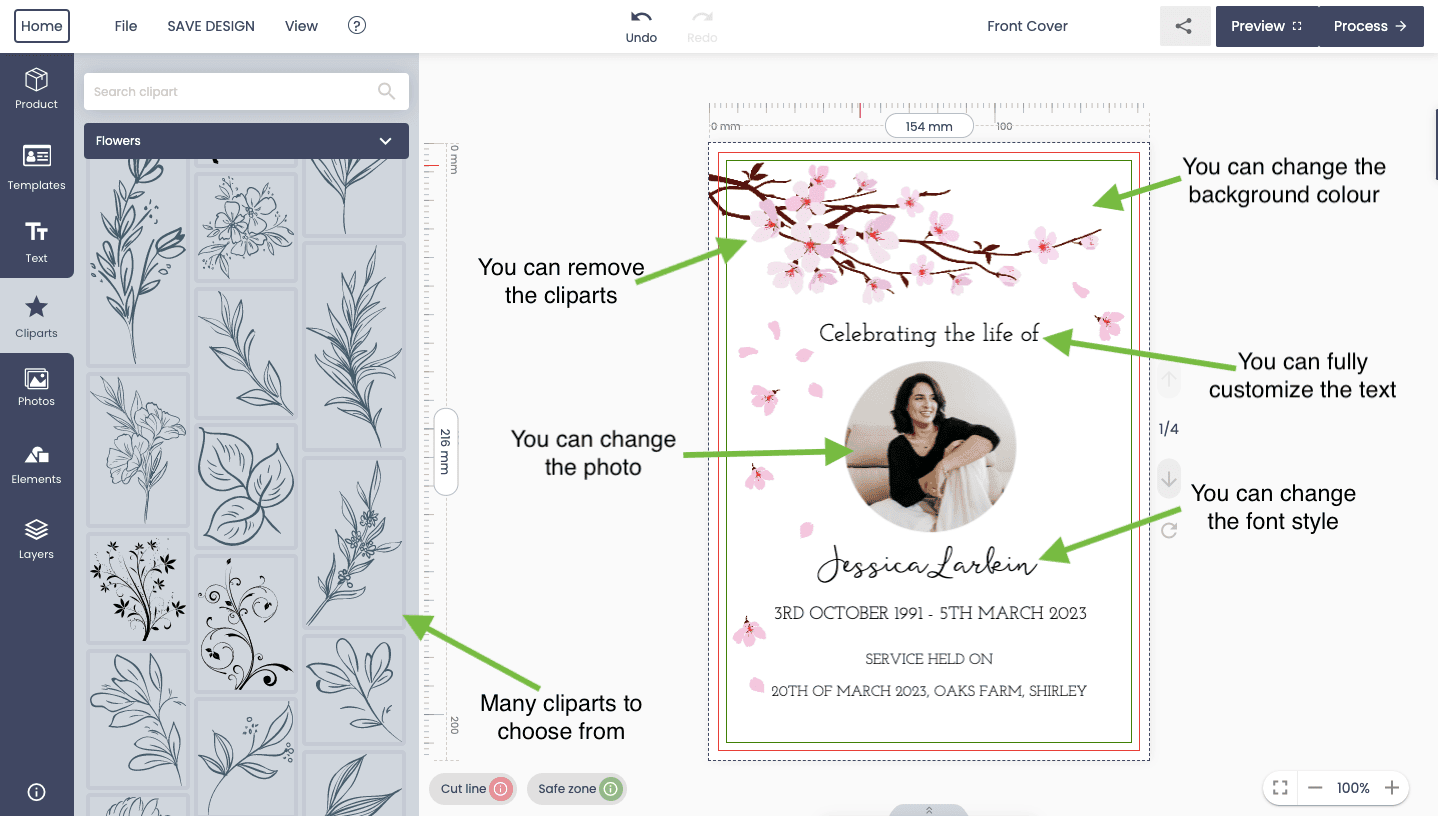 Here’s a step-by-step guide to help you use our design tool for editing or making your own design for a funeral order of service:
