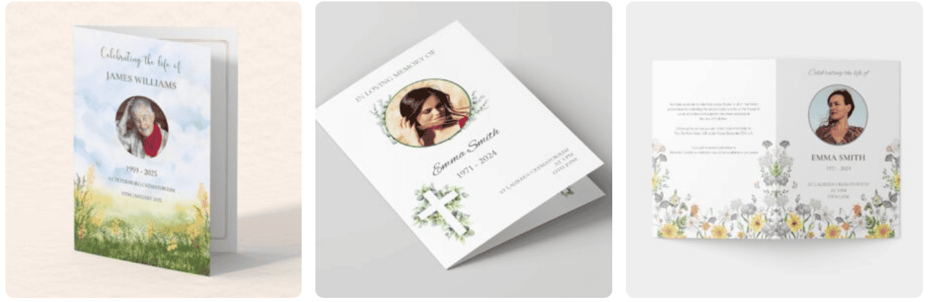 It depends on the type of service. We offer both religious designs (Christian, Catholic, etc.) with space for hymns and prayers, and non-religious or humanist templates that focus more on photos, quotes, or personal messages. Choose what best reflects your loved one’s beliefs and personality.