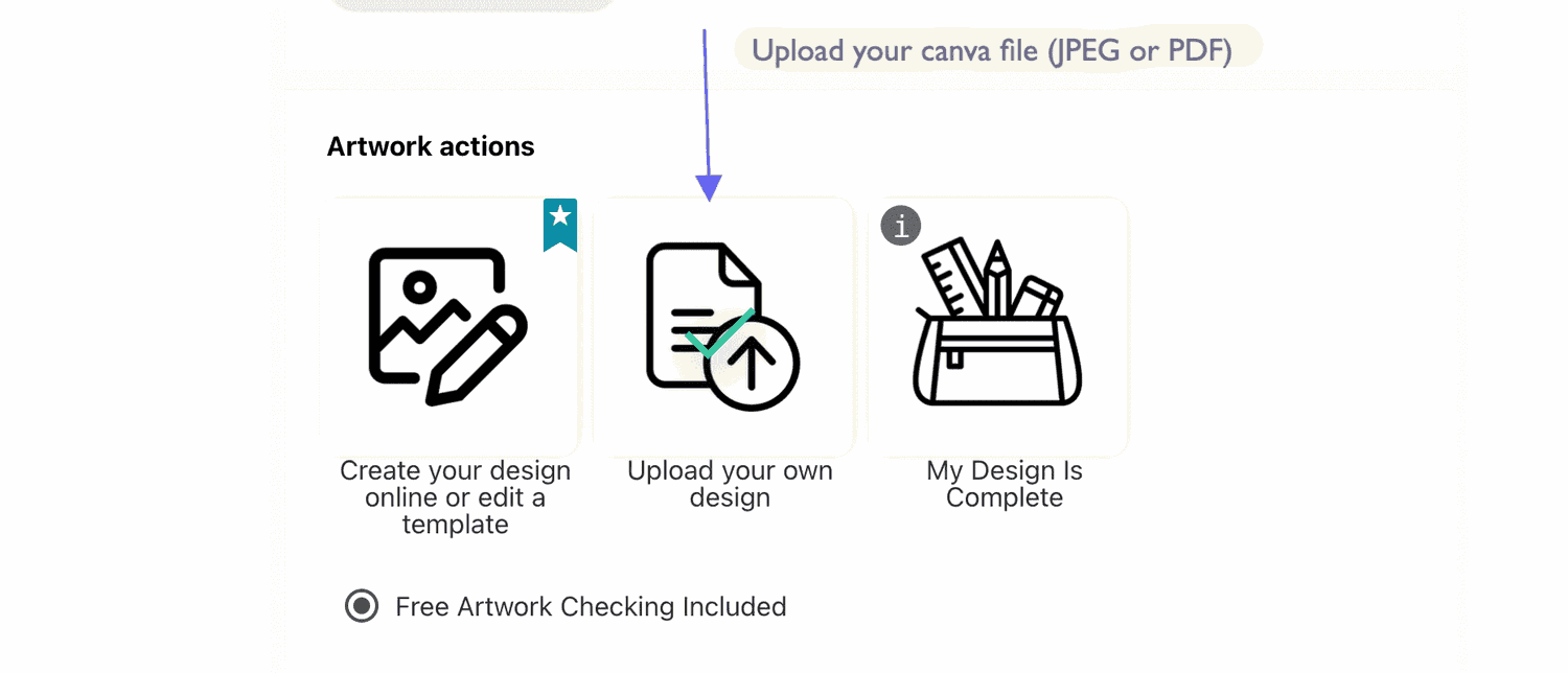 When ordering, scroll down to “Artwork Actions” and select “Upload Your Own Design” to upload your Canva file.