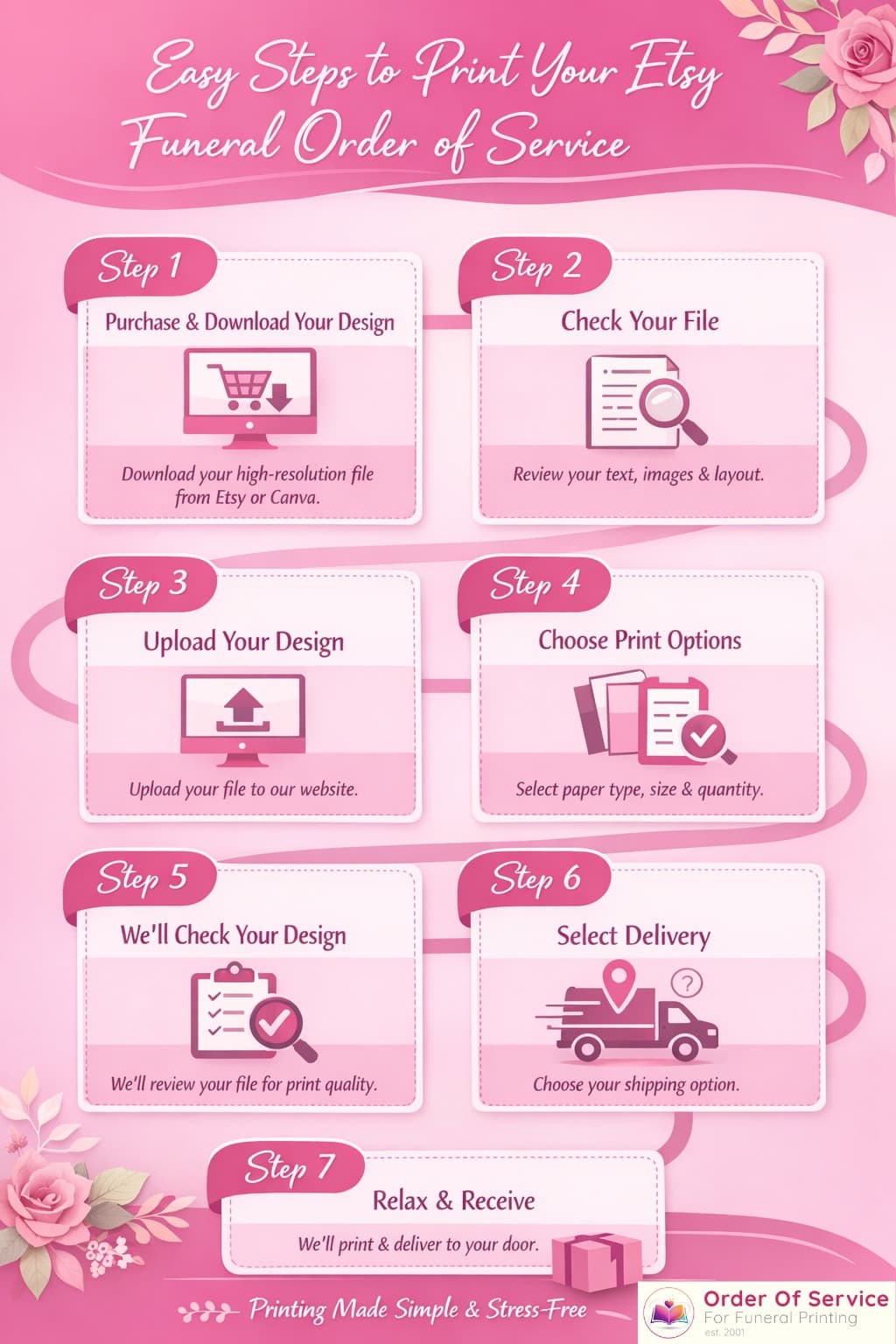 Visit our funeral order of service printing page and select the “Upload Artwork” option. Simply upload your Etsy or Canva design file.