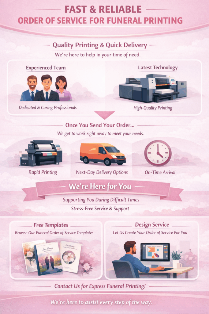 We understand that families may need the funeral orders of service printed and delivered urgently, That is why we offer express next order of service printing.