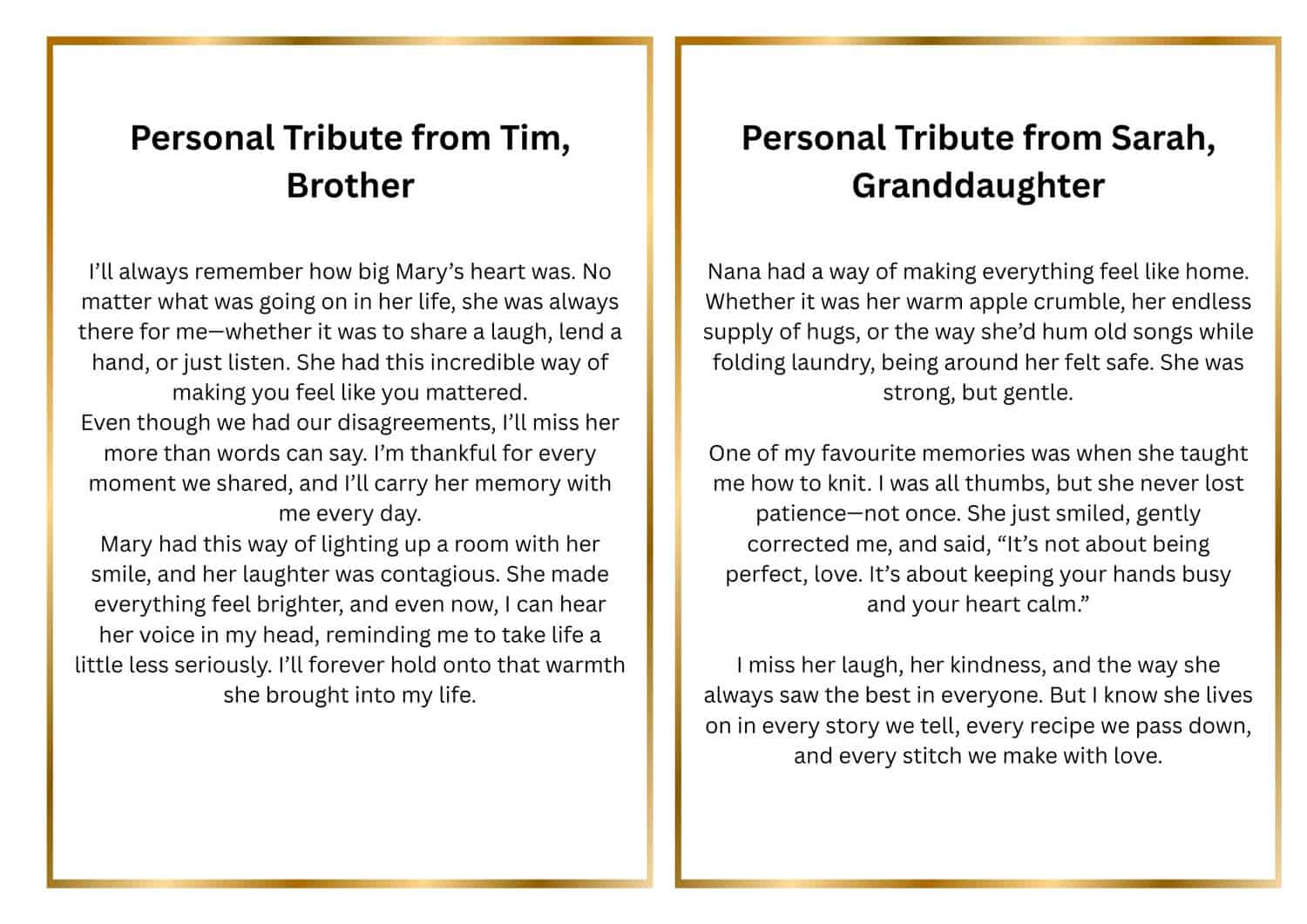 Personal tributes in a funeral order of service is a heartfelt message that honours the life, personality, and impact of the person who has passed away. Whether spoken during the ceremony or printed in the service booklet, a personal tribute allows loved ones to share memories, celebrate special moments, and express love, gratitude, or even humour in a meaningful way.