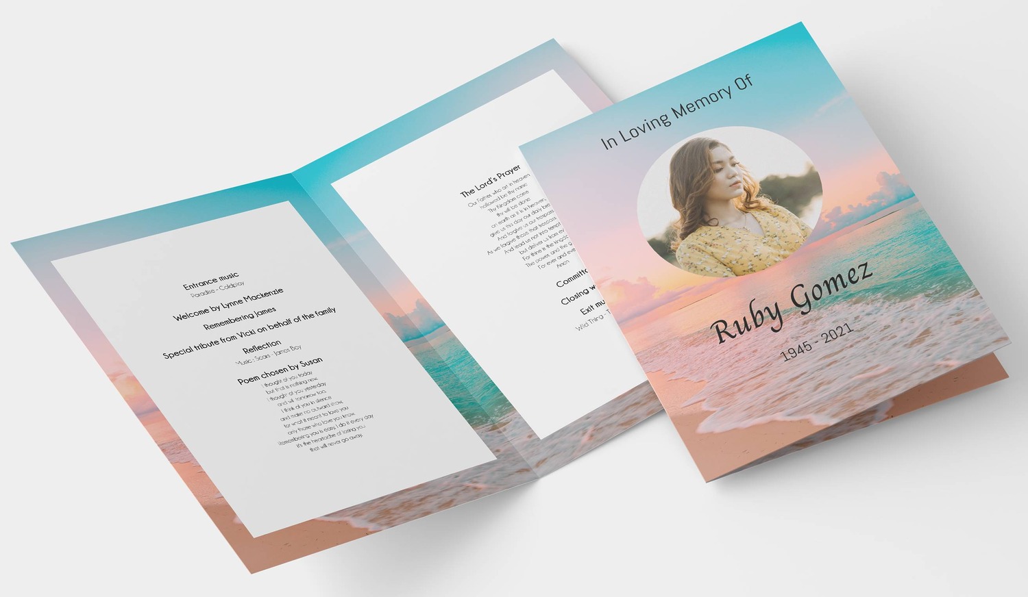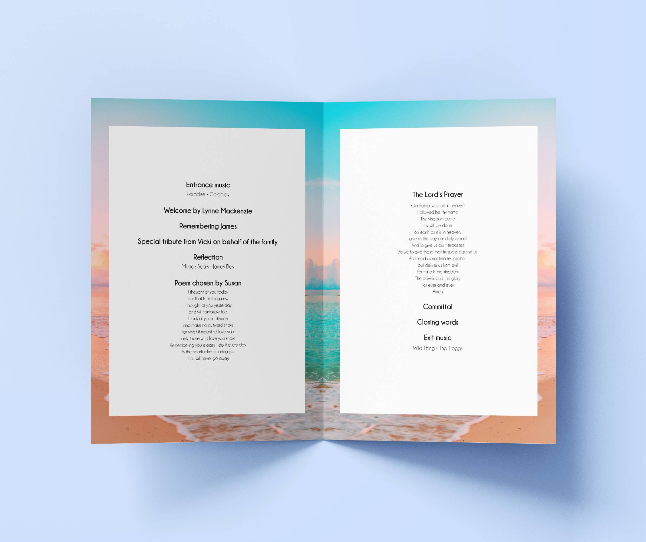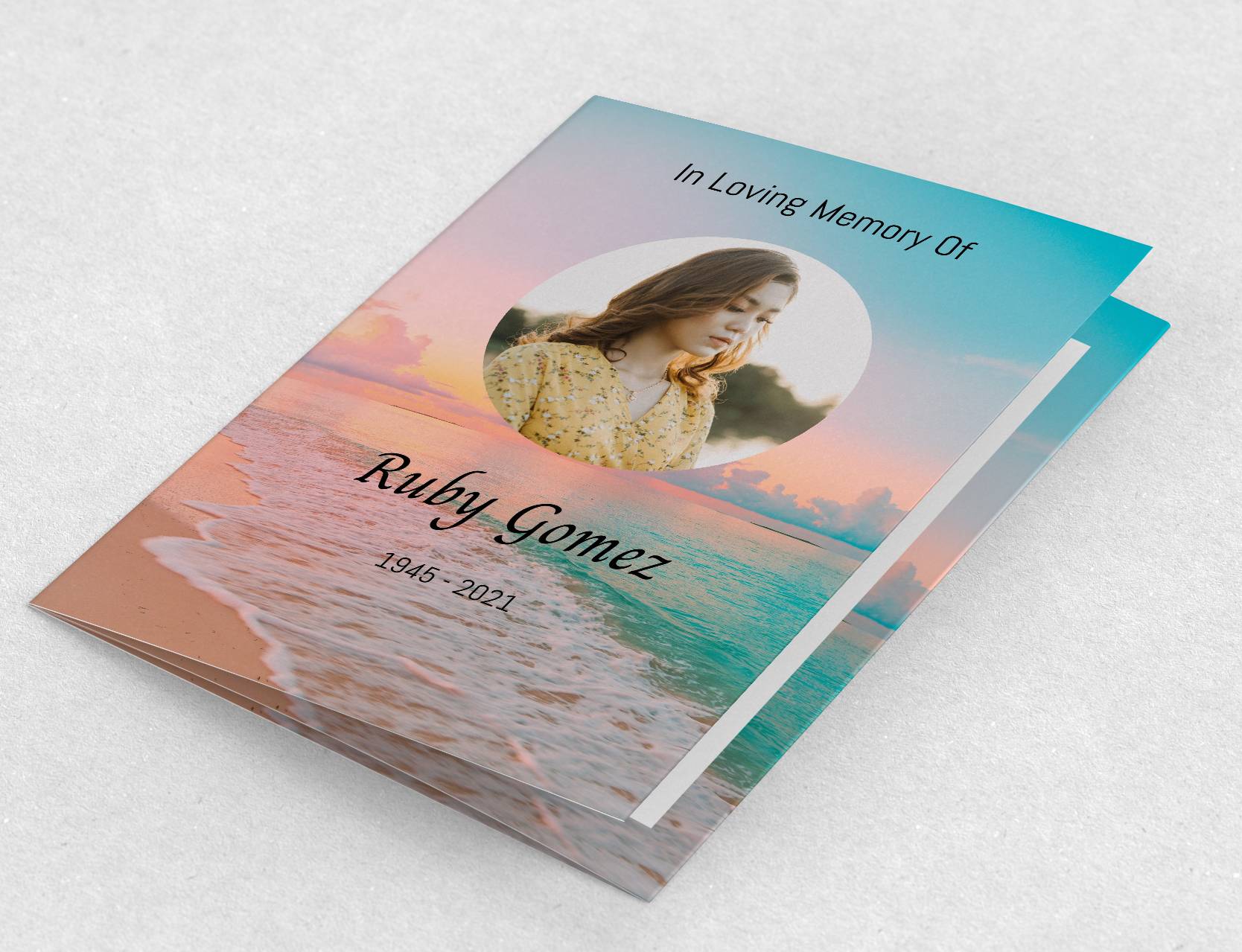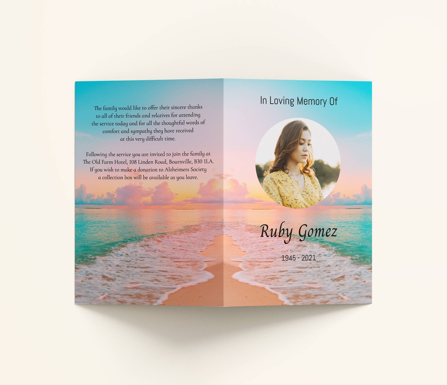 funeral order of service features a serene beach and sea on the front and is ideal for those who cherish calm and peace. The design is professional and simple to personalise, allowing you to create a one-of-a-kind keepsake that truly reflects your loved one's life. You can easily customise this template by adding your own photos, text, and details. The aqua colour combination adds a soothing touch of beauty to the service, helping to create a peaceful atmosphere. This template is an excellent way to remember a loved one with respect and dignity.