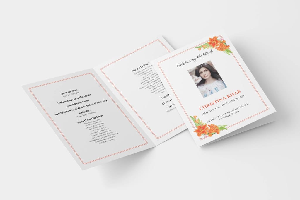 funeral order of service template. This bold and heartfelt design features striking orange lilies, symbolizing passion, confidence, and a life well-lived. It’s a beautiful and uplifting way to honour their memory.