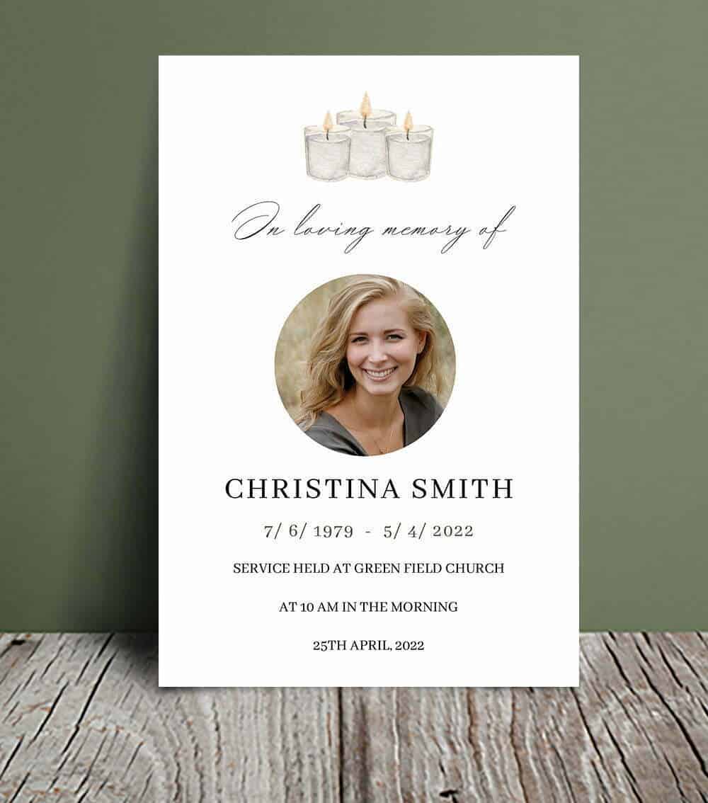 The front design of this template (Candle funeral program template 032) features 3 candles that represents light, love, and guidance. Light that the loved one brought into the lives of those who knew them, and the guidance they provided during their lifetime. Hope, as they remind us that even in the darkest of times, there is always a glimmer of light and hope. The design of the template is simple and elegant, allowing the candles to be the focal point, making it easy to read and follow the order of service. The template is easy to personalize, you can add your own pictures, words, and information to make it special for family and friends.