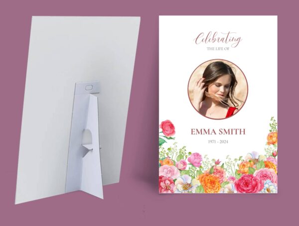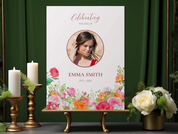 Honour your loved one’s life with “Colourful roses’ funeral sign board” a beautifully designed tribute perfect for any funeral or celebration of life. This personalised memorial board features a vibrant and beautiful array of colourful roses, symbolizing love, remembrance, and the joy of a life well-lived.