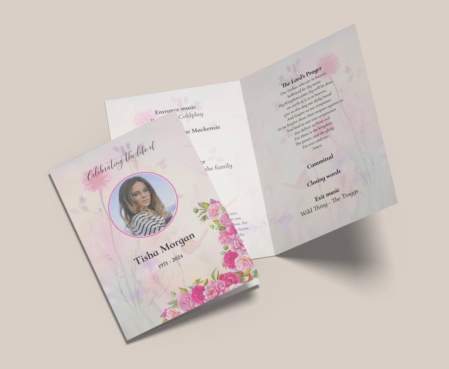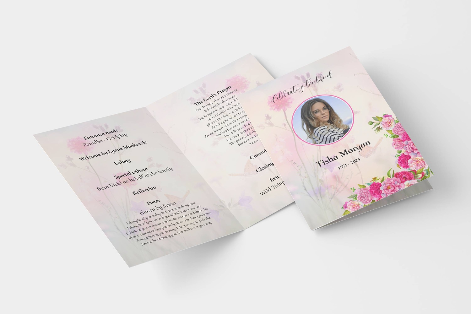 Dreamy floral background order of service funeral template" designed to showcase cherished memories. This elegant design features a soft, ethereal floral backdrop that brings a sense of peace, love, and serenity—ideal for creating a heartfelt celebration of life.
