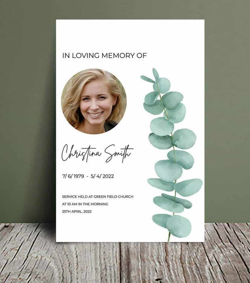 The Eucalyptus Funeral Order Program template (033) is an appropriate choice for honouring a loved one who passed away. It features eucalyptus leaves, which represent healing and protection, and the design is simple yet elegant, allowing you to honour your loved one's life with dignity and respect. This design is easily customizable, so you can use your own texts, fonts and pictures to create a funeral order of service, for your loved one.
