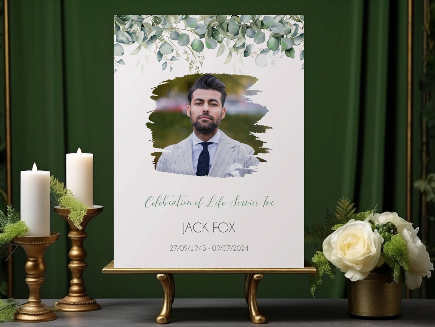 Honour your loved one’s life with “Greenery Eucalyptus funeral memorial board” a beautifully designed tribute perfect for any funeral or celebration of life. This personalised memorial board features a beautiful green eucalyptus plant symbolizing everlasting love.