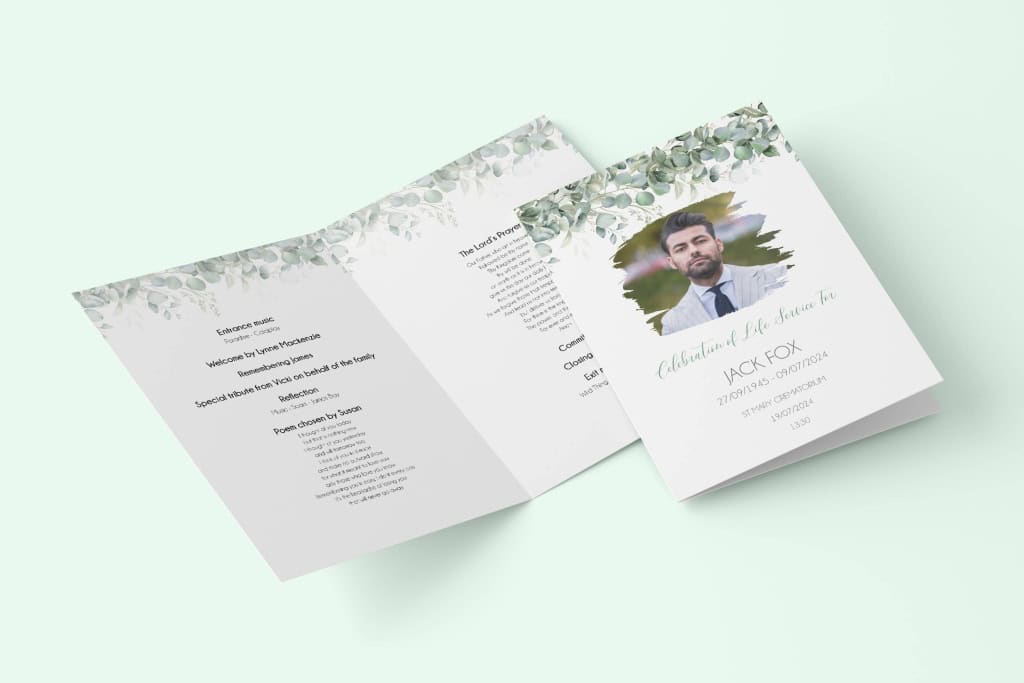 Celebrate the life of your loved one with our "Eucalyptus Greenery" funeral order of service template. This elegant design features soft eucalyptus leaves, symbolizing peace, strength, and the natural beauty of life’s journey. It offers a calm and heartfelt way to honour their memory.