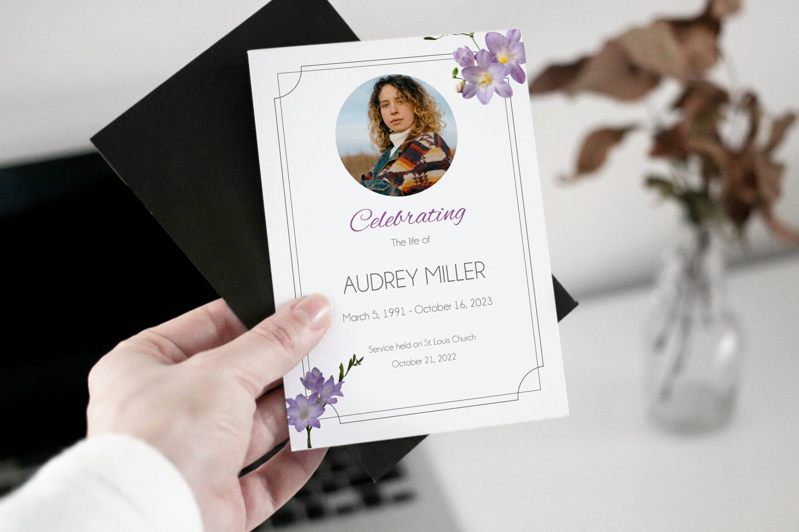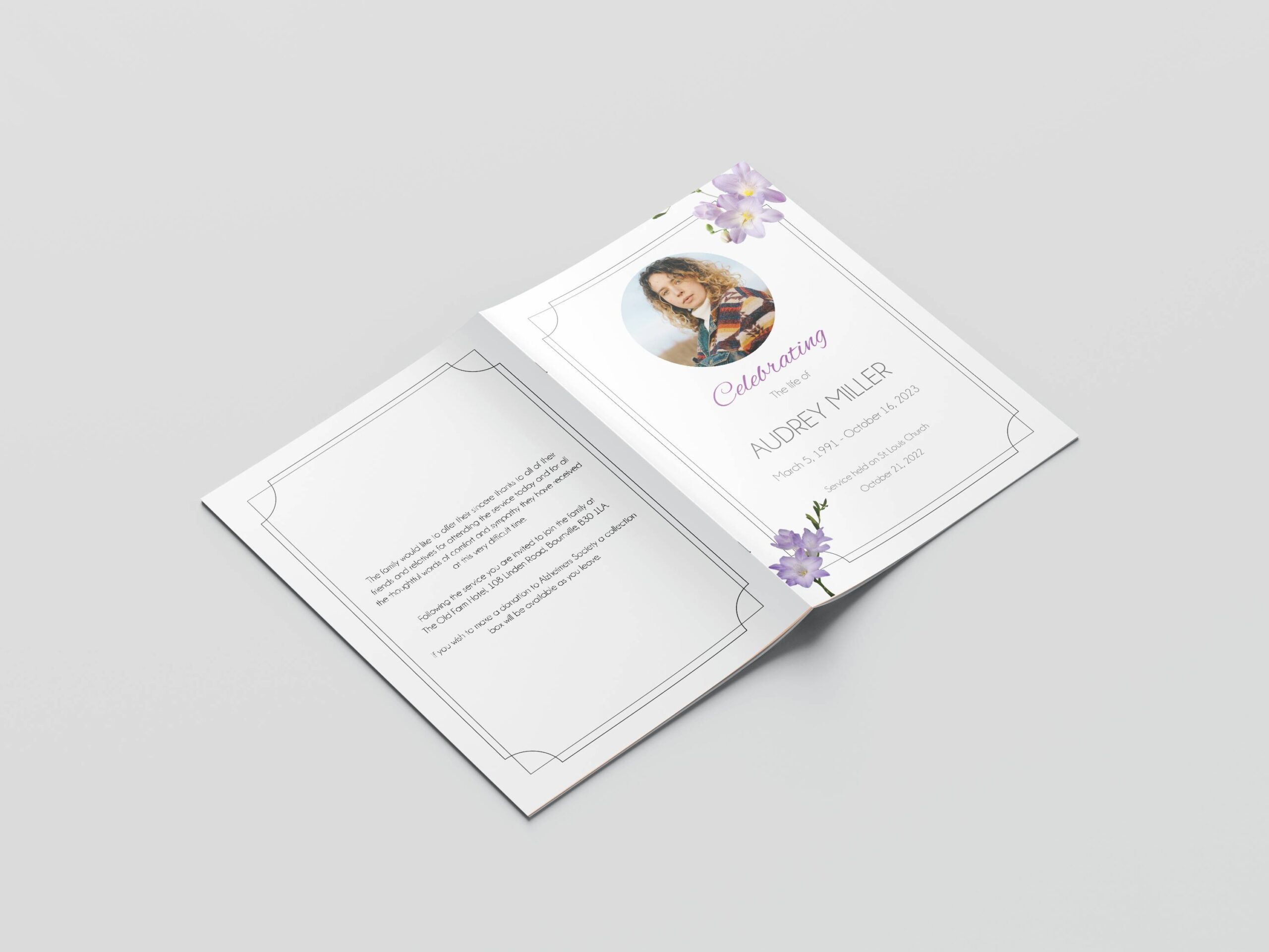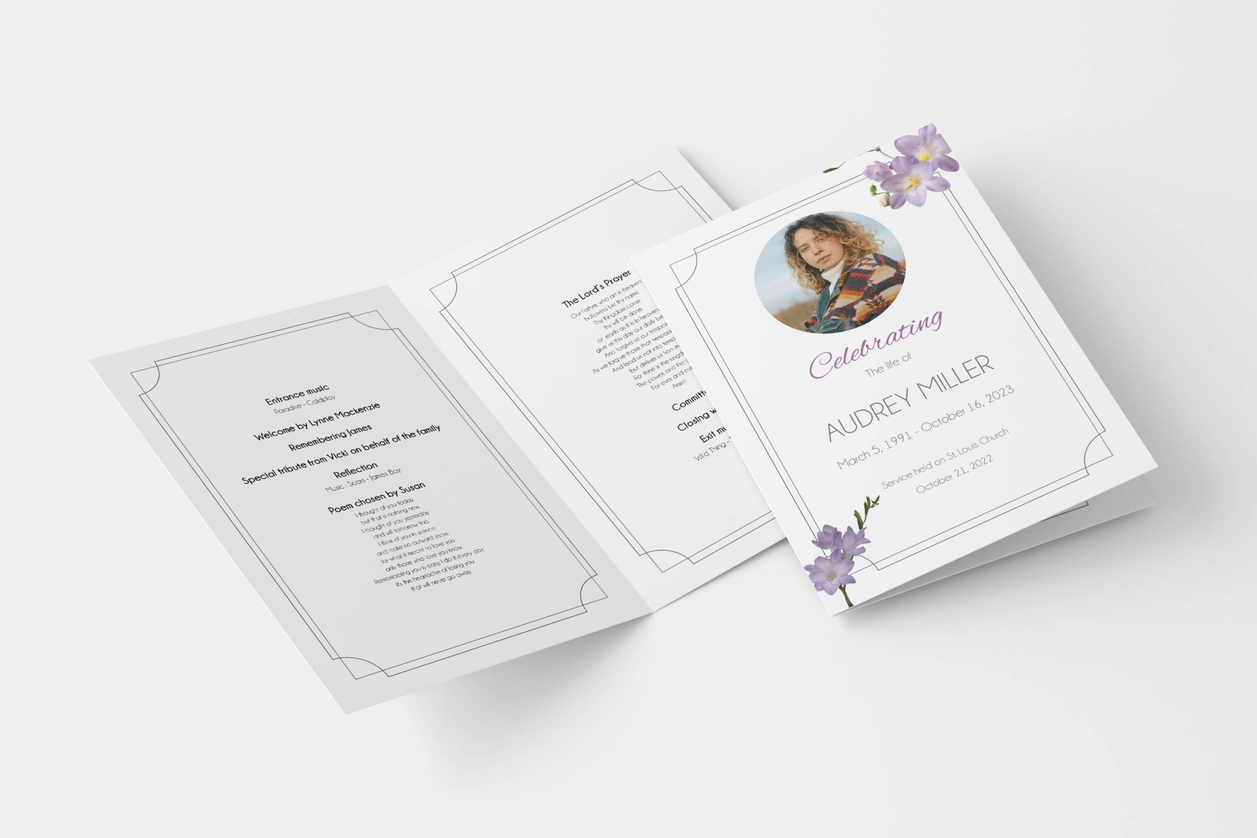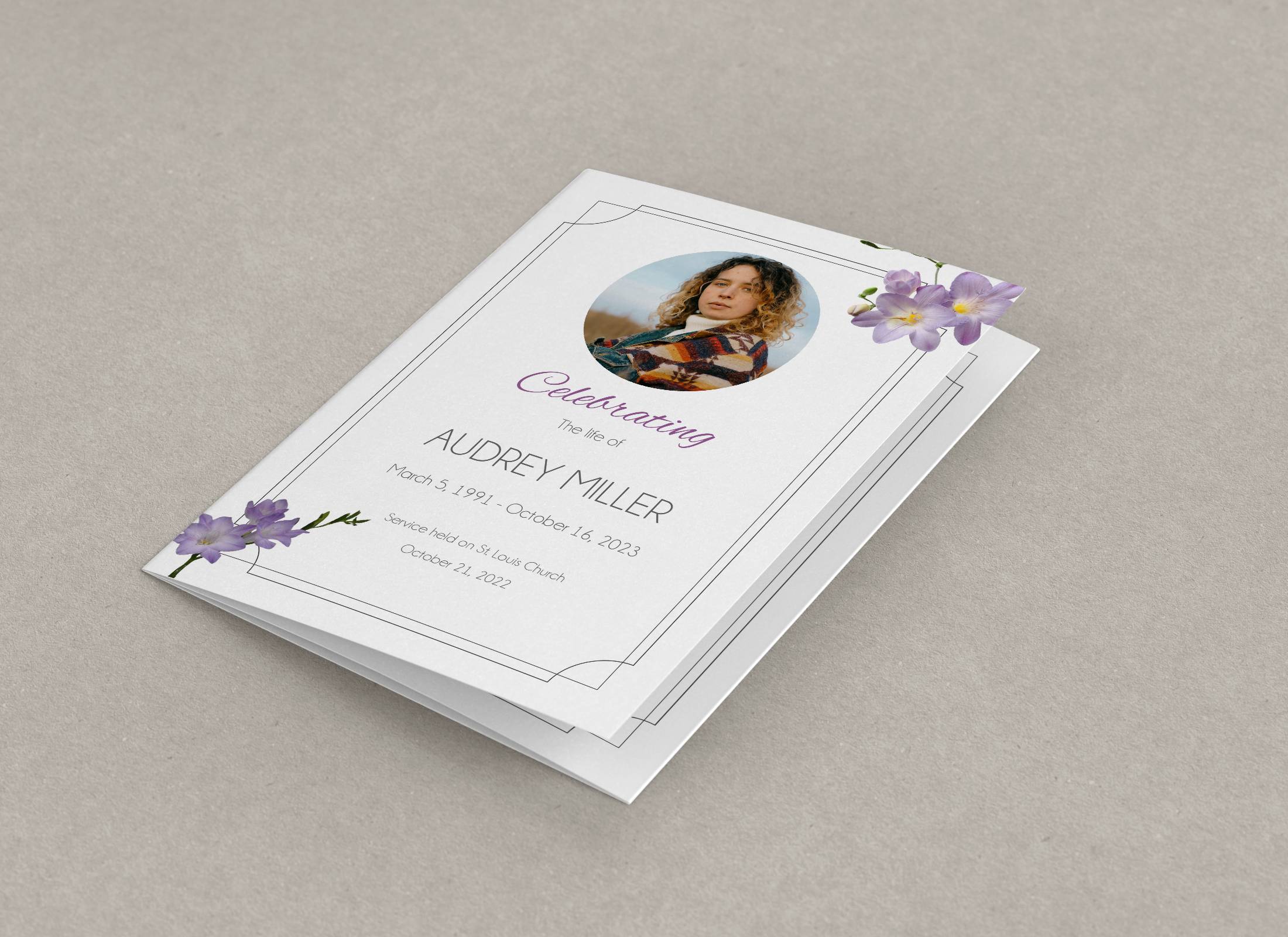 Celebrate the life and legacy of your loved one with our elegant "Freesia" funeral order of service template. Featuring the delicate and fragrant freesia flowers, this design symbolizes purity, friendship, and lasting remembrance, providing a beautiful and heartfelt way to honour their memory.