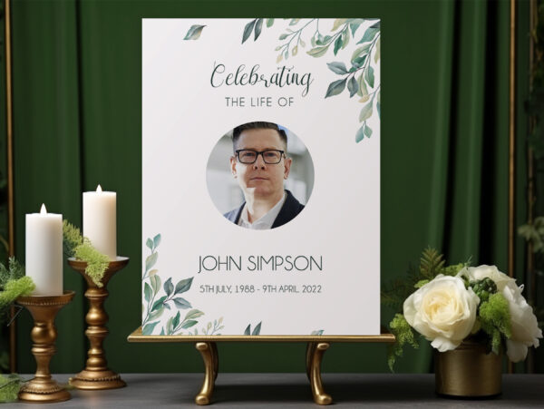 Honour your loved one’s life with “Greenery Funeral Memorial Sign Board” a beautifully designed tribute perfect for any funeral or celebration of life. This personalised memorial board features beautiful green leaves symbolizing warmth, beauty, and the enduring spirit of life.