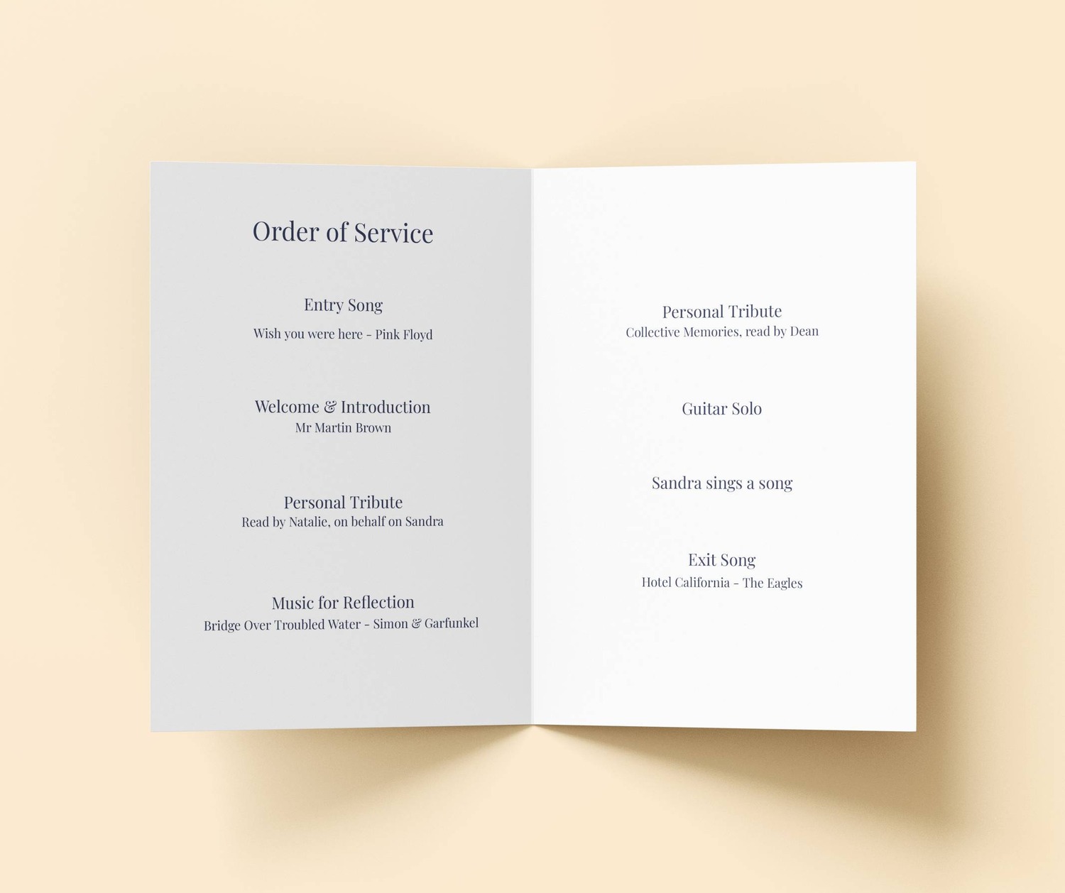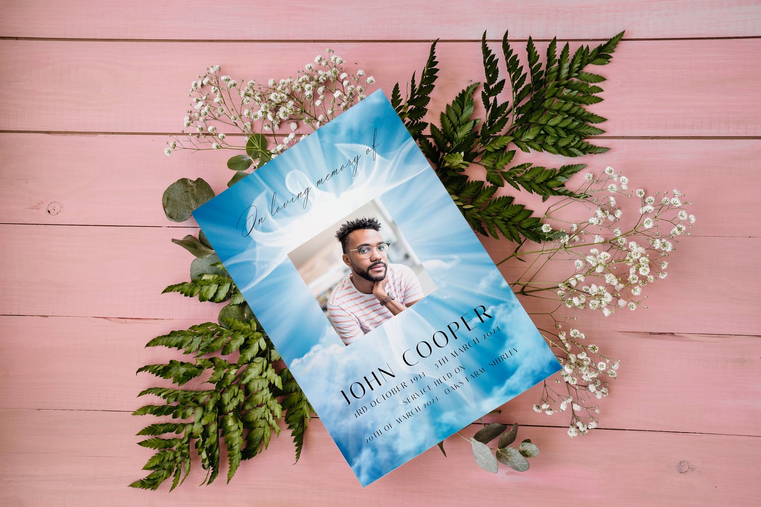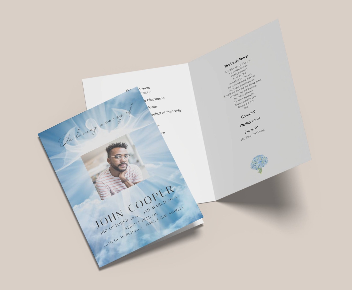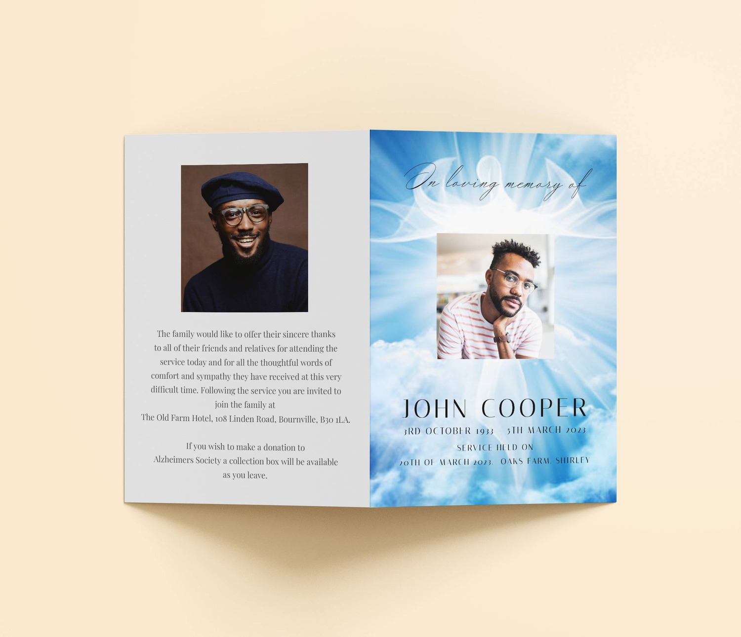 The "Heavenly" Funeral Order of Service template is crafted to offer a calm and spiritually uplifting atmosphere for commemorating a beloved individual. The cover of this template displays images that evoke a sense of serene divinity, such as a tranquil blue sky and gentle clouds. These visuals create a visually soothing and spiritually significant design. Inside, you can add the order of events for the funeral, such as the order of service, the ceremony, readings, the eulogy, hymns, and closing remarks The template provide options for personalization, allowing you to incorporate photographs, text, and quotes that hold spiritual significance and are pertinent to the life of the departed. This customization feature enables you to craft a unique and heartfelt memento that honours the person's spiritual beliefs and the cherished memories associated with them.