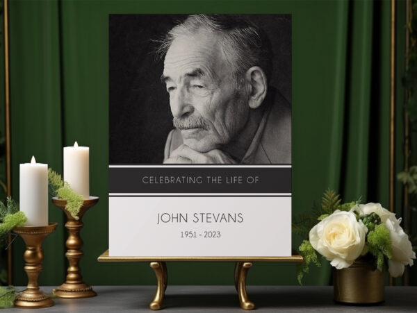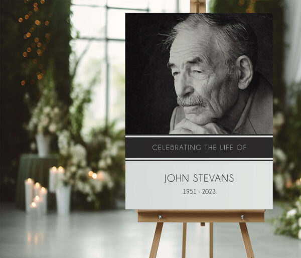 Honour your loved one’s life with “Modern funeral memorial sign board” a beautifully designed tribute perfect for any funeral or celebration of life. This personalised memorial board is designed to have more focus on your loved one’s photo without any added illustrations so that it’s clean and modern.