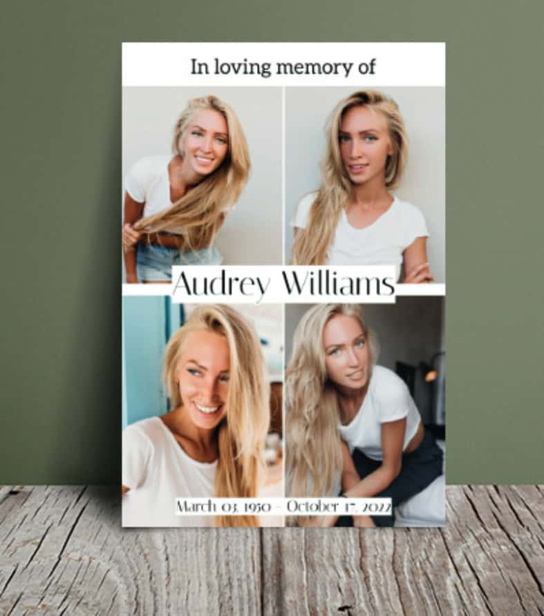 The cover of the funeral order of service template features a collage of photos, creating a visual tribute to the life of the deceased. The photos may be arranged in a tasteful and artistic manner, showcasing different moments, memories, and milestones of the person's life. The photos may be in colour or black and white, and they may be overlaid with a translucent filter or framed with decorative elements, creating a visually appealing and meaningful design. You can fully customize this funeral order of service template with your own texts and photos.