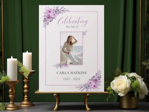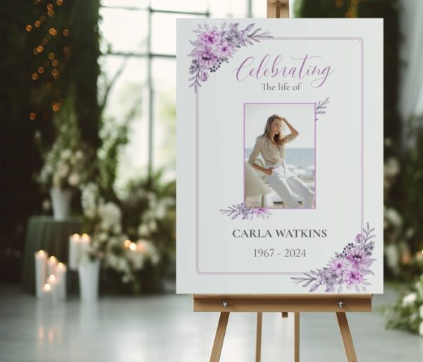 Honour your loved one’s life with “Purple floral funeral memory sign board 141” a beautifully designed tribute perfect for any funeral or celebration of life. This personalised memorial board features beautiful purple florals with delicate purple border. It offers a refined and heartfelt way to honour their memory.