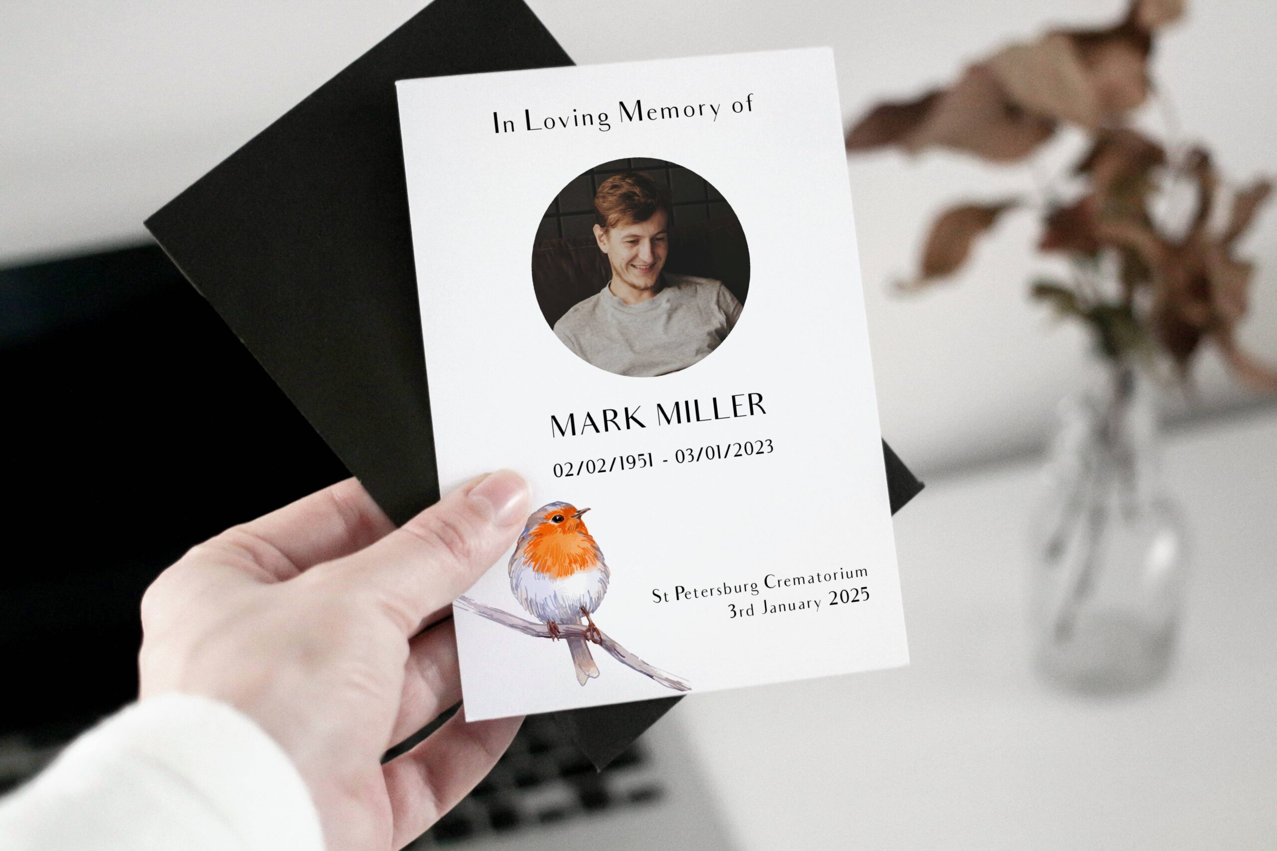 Robin Appearance funeral order of service template" featuring a delicate and symbolic robin, often seen as a sign from heaven and a messenger of love and remembrance. This peaceful design is perfect for a heartfelt tribute, bringing comfort and hope.