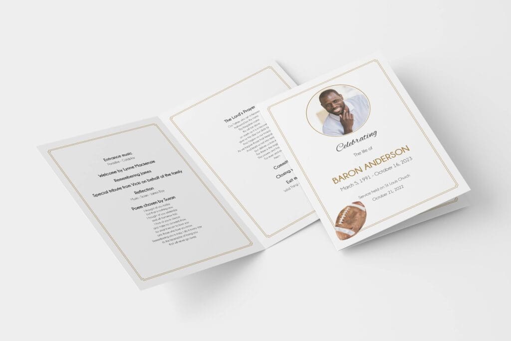 funeral order of service template. This unique design pays tribute to their love for the sport, featuring a rugby-inspired motif that combines elegance with personalization. It’s a heartfelt way to honour their vibrant spirit and dedication to the game.