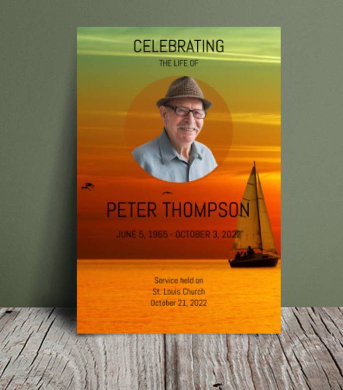 Moreover, the template offers customization options, enabling you to seamlessly integrate personal elements. Whether it's cherished photographs capturing moments on the water, heartfelt text, or meaningful quotes about the journey of life, this feature empowers you to create a truly distinctive and deeply heartfelt tribute. Through this capability for customization, you can craft a memorial service that authentically reflects the unique qualities and cherished memories associated with the departed individual, while embracing the symbolism of a sailing boat gracefully navigating the tranquil waters of the sunset.