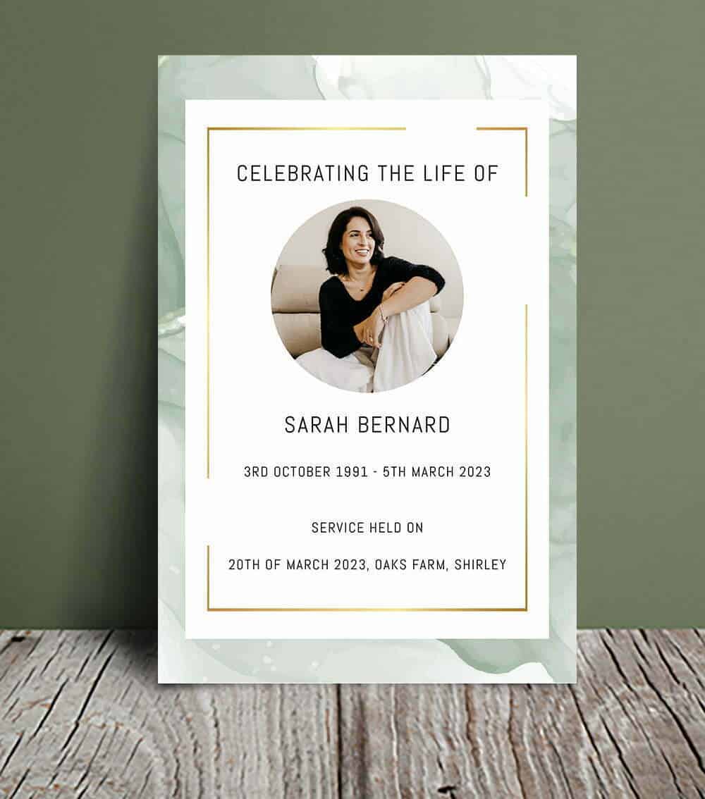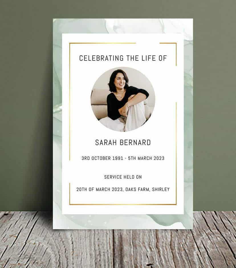 The Soothing Green Funeral Order of Service (048) template is a peaceful and comforting way to honour a loved one. The front design incorporates a soothing green shade that represent healing and renewal, making it an appropriate choice for a funeral or memorial service. This template can be easily customized with your own photos, text, and details to create a unique keepsake for your family and friends. The design is professional and elegant, allowing you to celebrate the life of a loved one. The soothing green theme brings a sense of calm to the service.