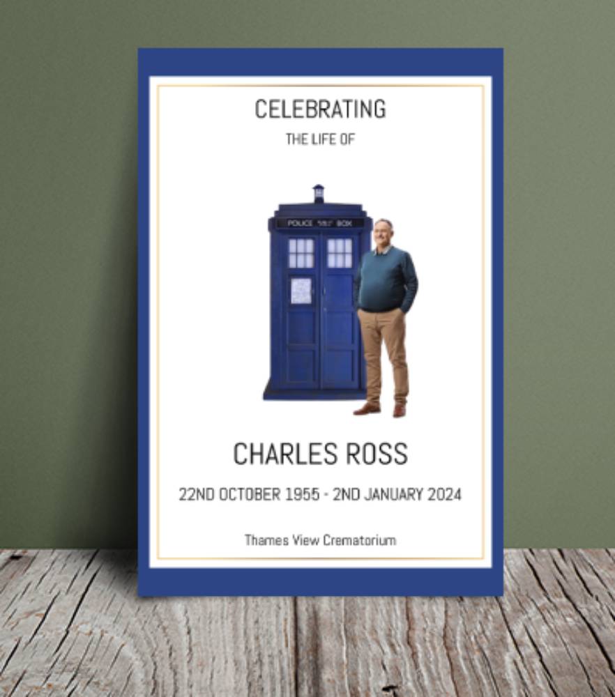 The "Time machine funeral order of service template 116" is a funeral program designed with Doctor Who-inspired element, with a TARDIS evoking a sense of time travel and adventure—a fitting tribute for a fan of the iconic TV series.