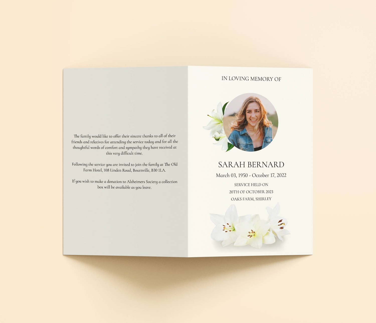 Celebrate the life of your loved one with the "White lilies' funeral order of service template" - a beautifully delicate and meaningful design featuring these timeless white flowers, symbolizing purity, renewal, and the promise of peace.
