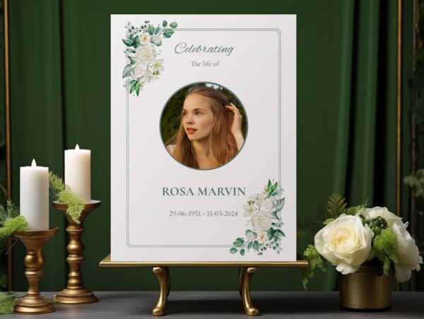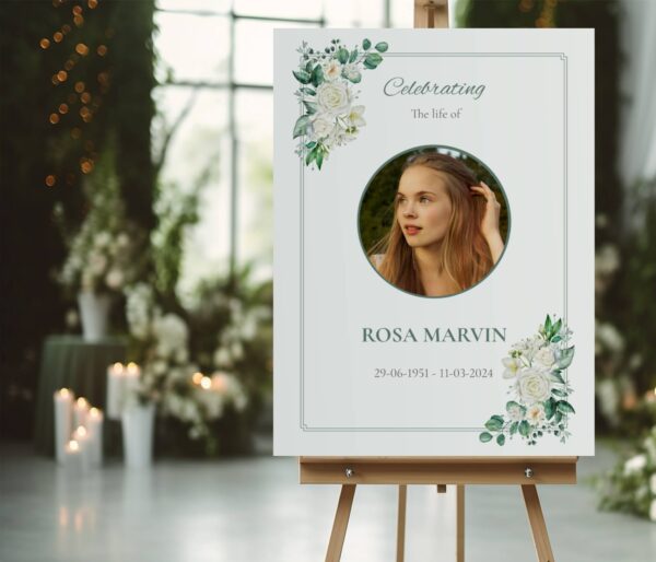 Honour your loved one’s life with “White rose funeral memorial photo board” a beautifully designed tribute perfect for any funeral or celebration of life. This personalised memorial board features delicate white roses, symbolizing peace and nature. It offers a gentle and heartfelt way to honour their memory.
